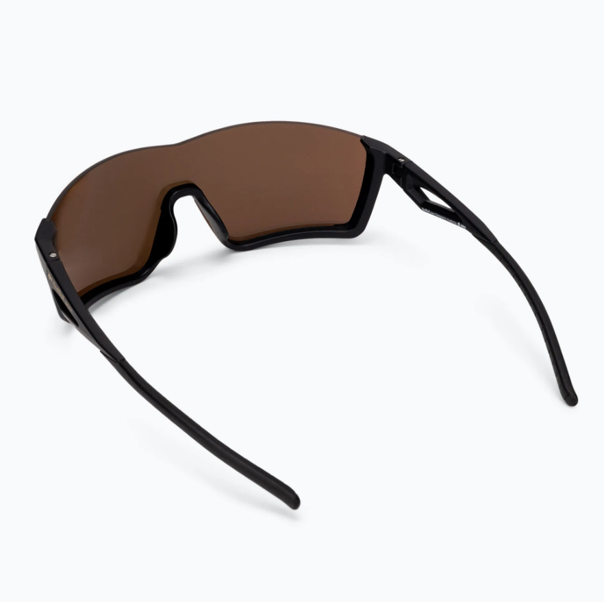 La gran lente panorámica con borde superior recto ofrece un amplio campo de visión y protege perfectamente contra la suciedad y los rayos UV. Los terminales de las patillas ajustables garantizan una sujeción segura y un ajuste ceñido. El armazón inferior está ingeniosamente oculto detrás de la lente, lo que da la impresión de ser unas gafas deportivas sin montura (frameless)
